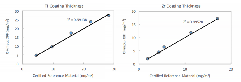 上述數據表明,使用Vanta手持式XRF分析儀獲得的鈦(Ti)、鋯(Zr)涂層厚度結果與參考材料的標定涂層厚度有非常好的相關性。