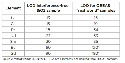 手持設備中的典型的X射線管只能工作到50 kV,稀土元素的有效激發能量差。而SciAps X-555采用55 kV的X射線管,大約能產生10倍以上的X射線有效激發能量。無干擾(二氧化硅)和高度具有挑戰性的OREAS REE礦石的值(這可以在圖2中找到)。LOD用于背景以上的3西格瑪檢測,120秒的測試時間。Sciaps光譜儀可作為化探手段。有規劃的進行土壤、巖石露頭測試,剖面測試,光譜數據可作為地質資料。常用礦石模式和土壤模式。無需進行樣品制備或簡單樣品制備。