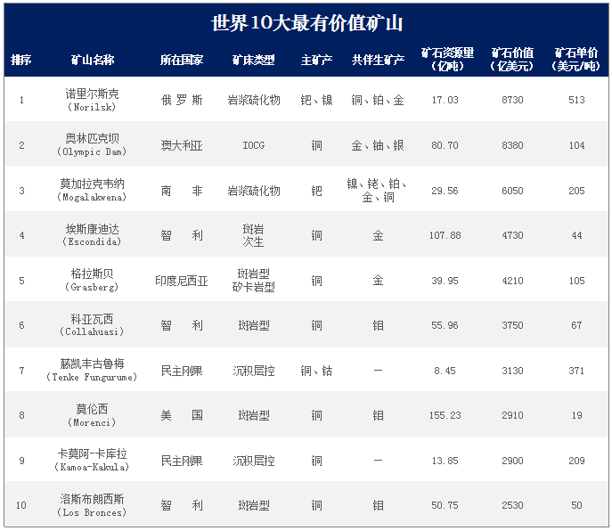 利用關聯公司礦業情報(MiningIntelligence)的數據,按照現行價格,Mining.com網站計算了礦山資源總價值,并列出了世界10大在產賤金屬和貴金屬礦山。