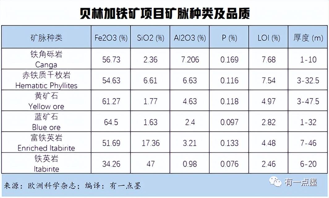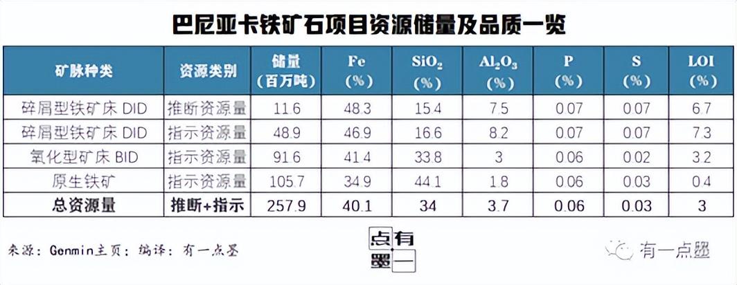 羅比羅比(Lobi-Lobi)資源量約1.68億噸,平均鐵品位約為41%;姆比蘭山(Monts M'bilan)資源量約2億噸,鐵品位介于38%至45%之間;巴尼亞卡鐵礦項目(Baniaka)的控制和推斷資源量,總計2.57億噸鐵礦。