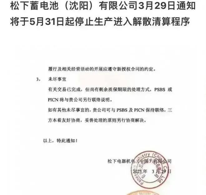 近日,位列世界500強(qiáng)企業(yè)松下株式會(huì)社旗下公司松下蓄電池(沈陽)工廠發(fā)布了一份公告,宣布將會(huì)在2023年5月31日前全面停止生產(chǎn),進(jìn)入解散清算程序并不再開展任何經(jīng)營活動(dòng)。意味著這個(gè)從1994年來沈陽投資建廠的企業(yè)結(jié)束了29年的生產(chǎn),正式退出了中國市場(chǎng)。