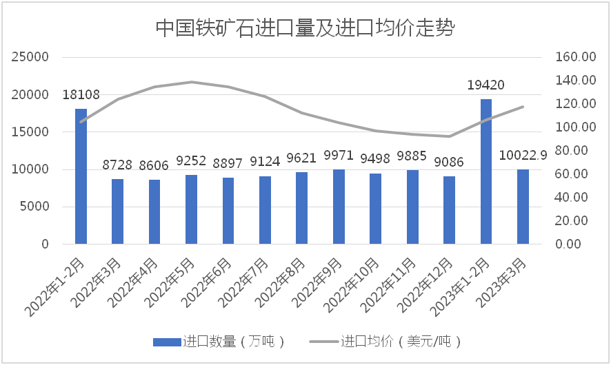 據(jù)海關(guān)總署數(shù)據(jù)顯示,2023年1-3月份,我國(guó)累計(jì)進(jìn)口鐵礦石29433.5萬(wàn)噸,同比增長(zhǎng)9.8%,進(jìn)口均價(jià)110.6美元/噸,同比下降12.0%。但值得注意的是,今年3月份,我國(guó)進(jìn)口鐵礦石量?jī)r(jià)齊升,單月進(jìn)口鐵礦石達(dá)到10022.9萬(wàn)噸,同比增長(zhǎng)14.8%,進(jìn)口均價(jià)為117.7美元/噸,較今年1-2月均價(jià)上漲11.43美元/噸,增長(zhǎng)10.76%。