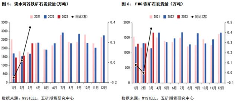據(jù)mysteel和五礦期貨統(tǒng)計(jì),四大礦山3月份發(fā)貨數(shù)據(jù)同比大幅增加。3月份力拓發(fā)貨量2595.6萬(wàn)噸,同比增加50%;必和必拓發(fā)貨量2152萬(wàn)噸,同比增加25%。淡水河谷發(fā)貨量2189.4萬(wàn)噸,同比增加30%;FMG發(fā)貨量1622.3萬(wàn)噸,同比增加41%。