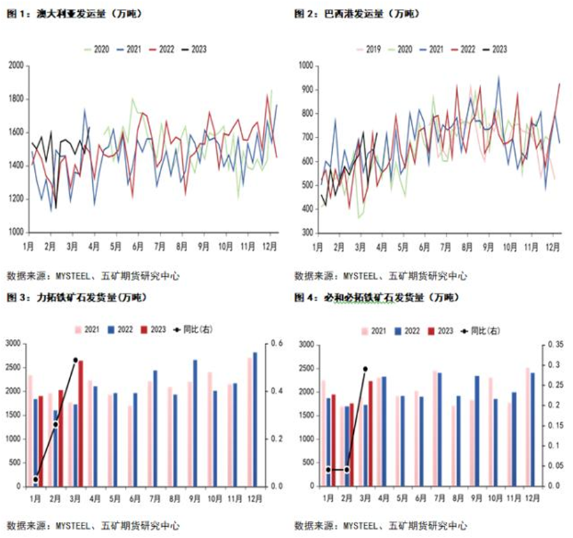 從供給端來(lái)看,今年一季度澳巴發(fā)運(yùn)量較去年有所增加,一季度澳大利亞同比增加18%,巴西同比增加14%。其中,3月份澳大利亞(發(fā)往中國(guó))總發(fā)運(yùn)量7648.9萬(wàn)噸,同比增加38.6%;巴西總發(fā)運(yùn)量3194.5萬(wàn)噸,同比增加38.4%。