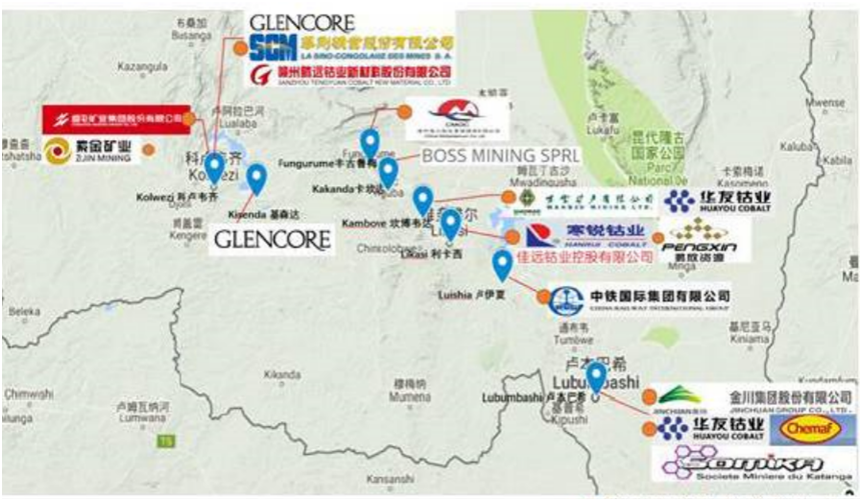 目前,中資在剛果(金)的主要項目包括:紫金礦業的Kamoa和Kolwezi銅礦、洛陽鉬業的Tenke Fungurume和Kisanfu銅鈷礦、五礦資源的Kinsevere銅礦、中國有色礦業集團與剛果(金)國家礦業總公司的Deziwa礦山等。
