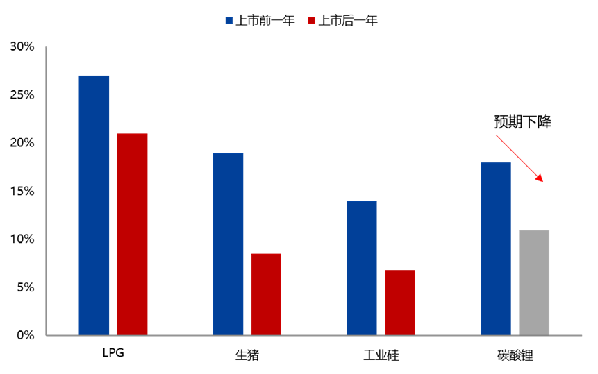 據相期貨公司預測,參考最近三年新增的品種LPG、生豬和工業硅,上市后歷史波動率均值較之前明顯下降。最近一年電池級碳酸鋰歷史波動率均值為18%,期貨上市后預計逐步下降至11%左右。