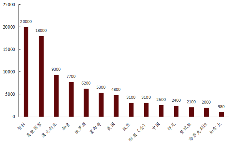 全球銅資源儲量分布較集中,據USGS數據,2022年全球銅儲量8.9億噸,其中智利、澳大利亞、秘魯儲量規模居前,分別占比21%、11%、9%,CR3達到 41%。從供應來看,智利、秘魯、剛果(金)為全球銅礦最重要的供給來源,2022年銅礦產量分別達520、220、220萬噸,占全球銅礦供給分別 24%、10%、10%。值得注意的是,智利正面臨礦山老化、品位下降的問題,年產量于2018年見頂于583 萬噸,隨后逐年下滑;秘魯2019年產銅246萬噸,隨后受疫情和當地政局等因素擾動有所減量,也在逐年下滑,2022年產量220萬噸;而非洲代表國家剛果(金)銅供給增量顯著,逐漸成長為最重要的供給國之一,年產量從2012年的60萬噸增長到2022年的220 萬噸,與老牌產銅國秘魯相當。