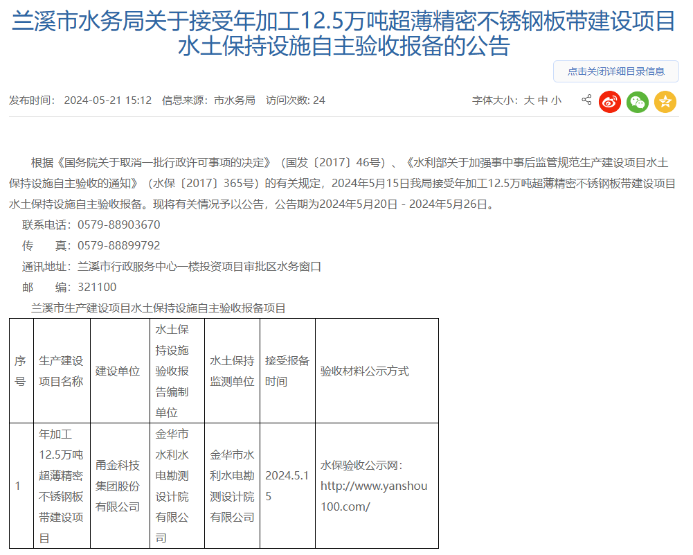 5月21日,蘭溪市水務局接受浙江甬金科技集團股份有限公司年加工12.5萬噸超薄精密不銹鋼板帶建設(shè)項目水土保持設(shè)施自主驗收報備并對外進行公告,公告期:2024年5月20日-2024年5月26日。