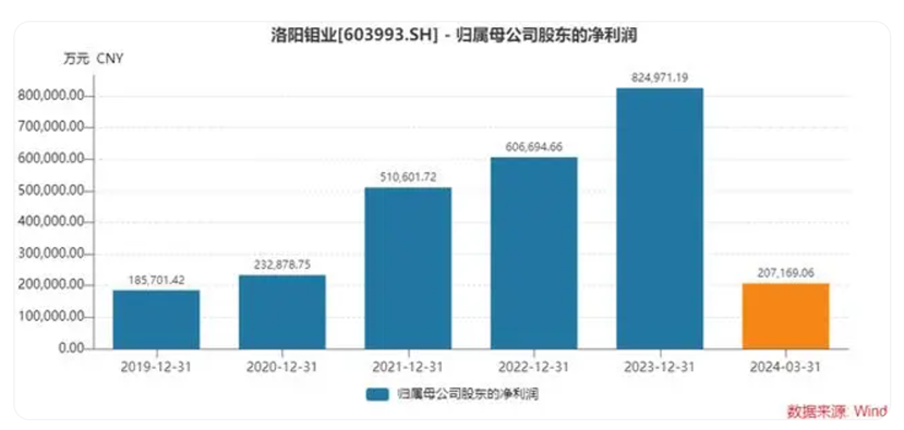 據洛陽鉬業披露的2024年上半年業績預告顯示,預計上半年實現凈利潤潤為51.89億元到57.35億元,同比增加638%至716%,其中今年二季度凈利潤高達31.17億元至36.63億元,為上市以來單季利潤次高。據測算,洛陽鉬業2024年凈利潤將達到110-120億元。