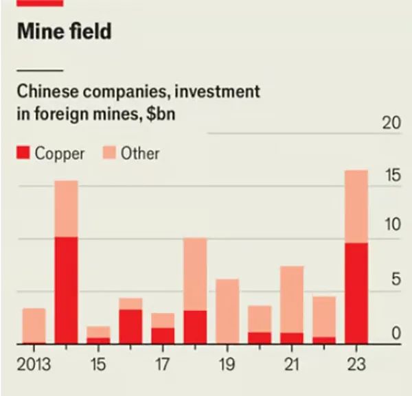 在具體礦產(chǎn)投資上,中國(guó)公司也非常具有戰(zhàn)略性。《經(jīng)濟(jì)學(xué)人》稱(chēng),隨著中國(guó)在電池、電動(dòng)汽車(chē)和太陽(yáng)能電池板等產(chǎn)品上越來(lái)越具有競(jìng)爭(zhēng)力,中國(guó)對(duì)海外礦業(yè)的投資也越來(lái)越多。銅礦是電氣化的重要材料,去年中國(guó)企業(yè)對(duì)這種這礦產(chǎn)的投資約占其海外礦產(chǎn)投資的3/5。