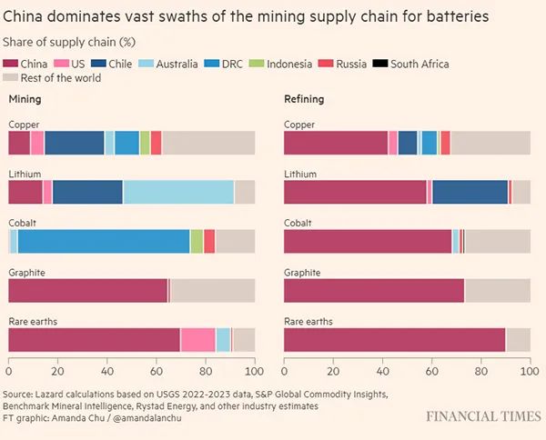 中國(guó)在幾種制造電池的關(guān)鍵礦產(chǎn)供應(yīng)鏈中占據(jù)主導(dǎo)地位,深紅色部分代表中國(guó),從上至下列出的礦產(chǎn)分別為銅、鋰、鈷、石墨和稀土。