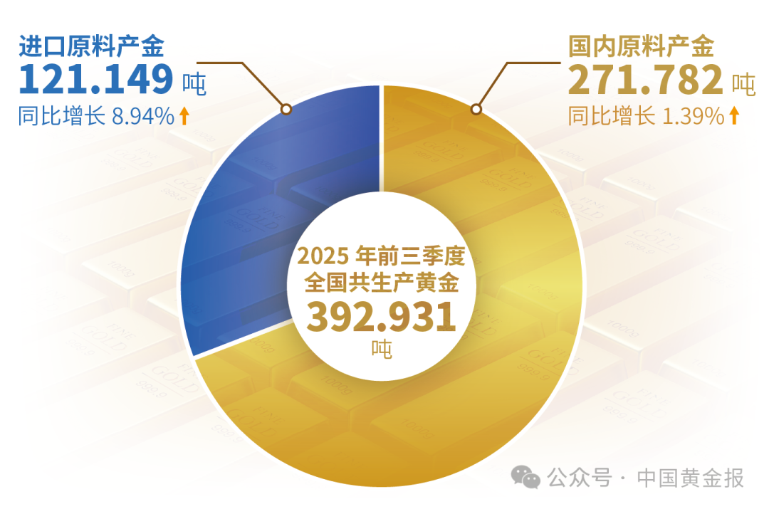 黃金生產 據中國黃金協會最新統計數據顯示:2025年前三季度,國內原料產金271.782噸,比2024年同期增加3.714噸,同比增長1.39%。另有進口原料產金121.149噸,同比增長8.94%。國內原料和進口原料共計生產黃金392.931噸,同比增長3.6%。