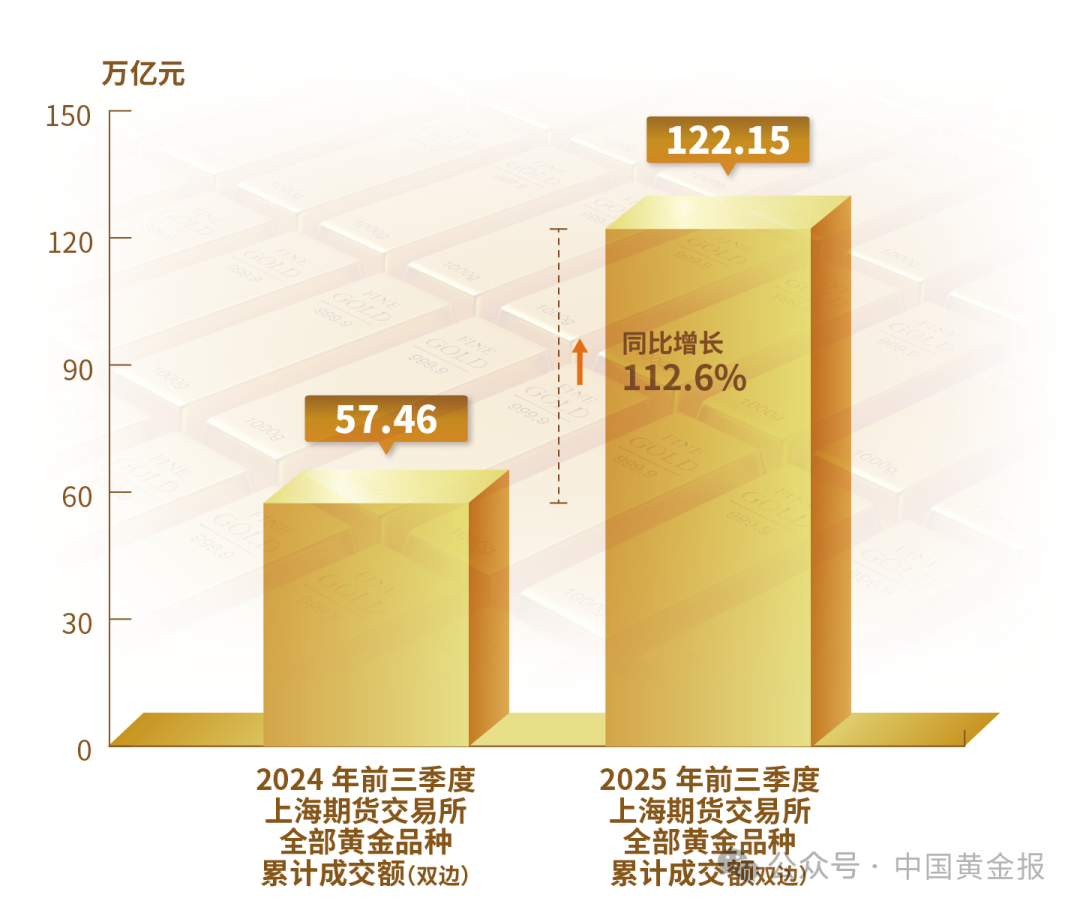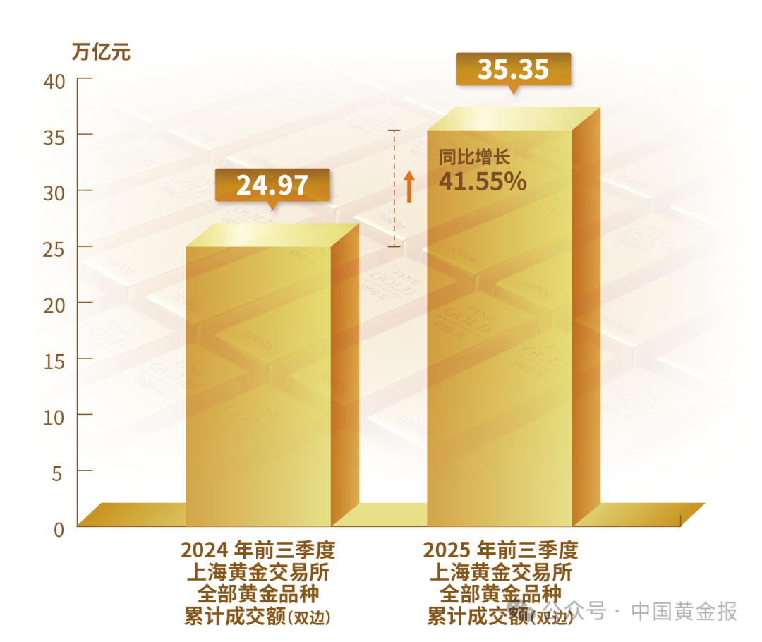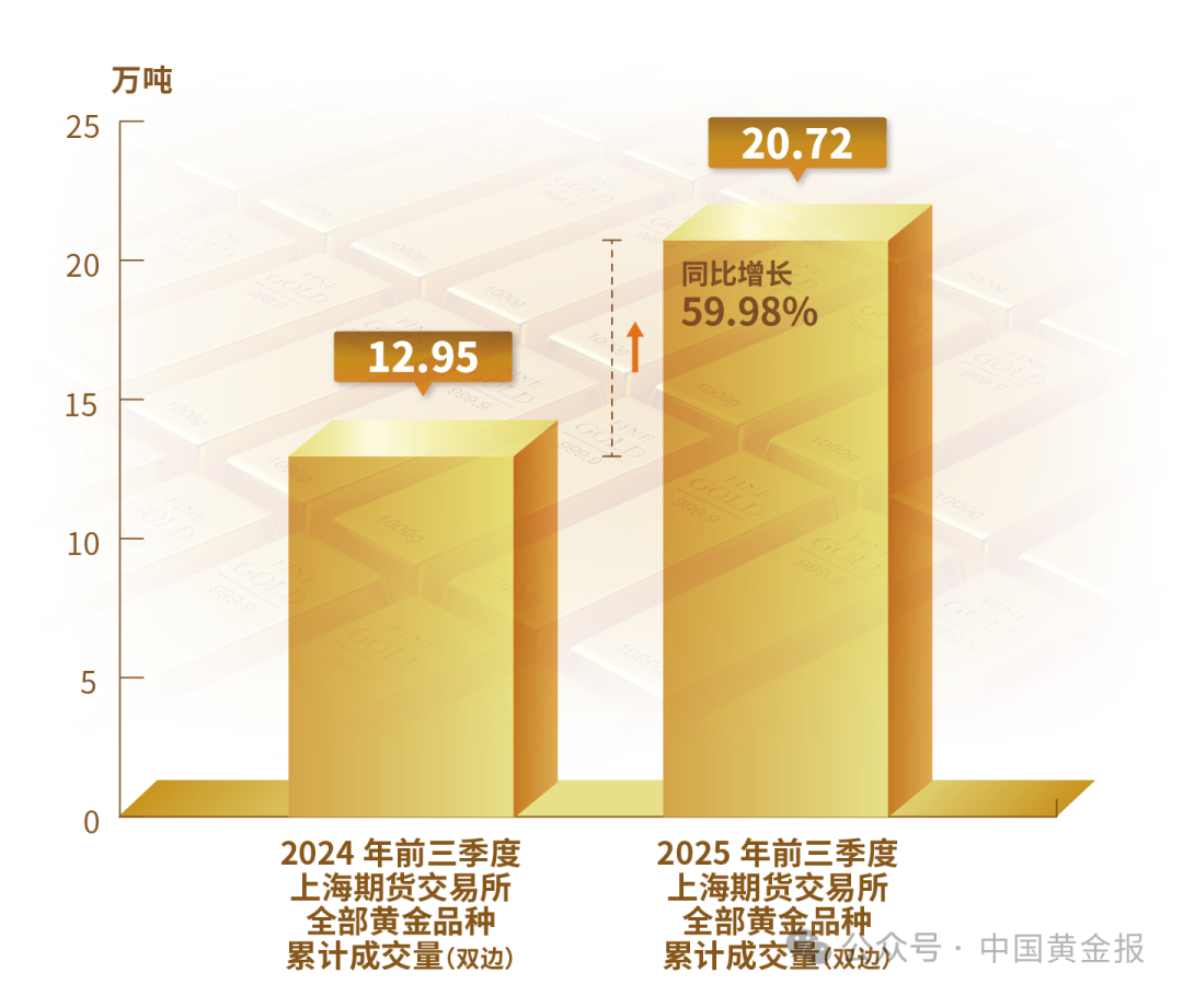 不同品類黃金產品的表現差異明顯。輕克重、附加值高的首飾產品仍保持較強市場吸引力,銷售情況較好。金條需求仍然旺盛,地緣沖突加劇與經濟不確定性使得黃金避險保值的功能進一步凸顯。電子、新能源等產業的快速發展使得工業用金需求穩步回升。 黃金市場 2025年前三季度,上海黃金交易所全部黃金品種累計成交量單邊2.38萬噸(雙邊4.76萬噸),同比上升2.45%;累計成交額單邊17.68萬億元(雙邊35.35萬億元),同比上升41.55%。上海期貨交易所全部黃金期貨期權累計成交量單邊10.36萬噸(雙邊20.72萬噸),同比上升59.98%;累計成交額單邊61.08萬億元(雙邊122.15萬億元),同比上升112.6%。